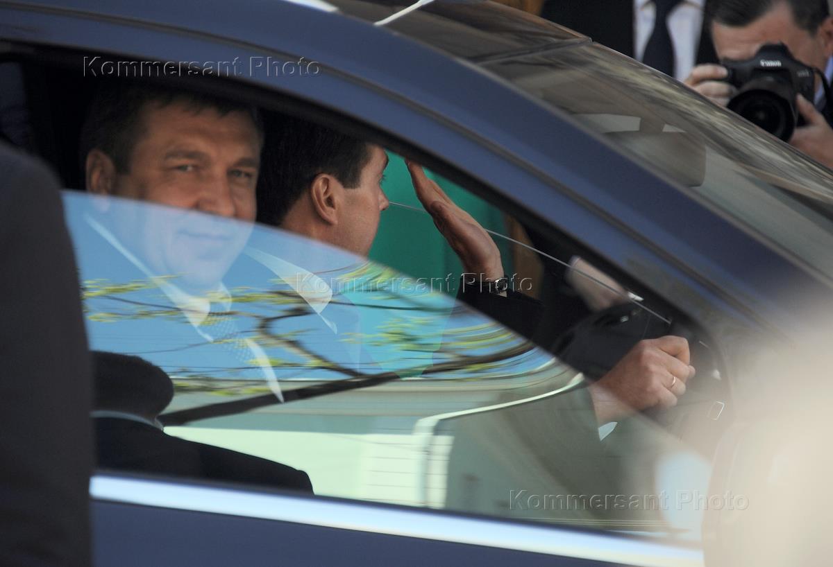 Губернатор Костромской области Игорь Слюняев (слева) и президент России Дмитрий Медведев (справа) в автомобиле после посещения избирательной комиссии Костромской области.
