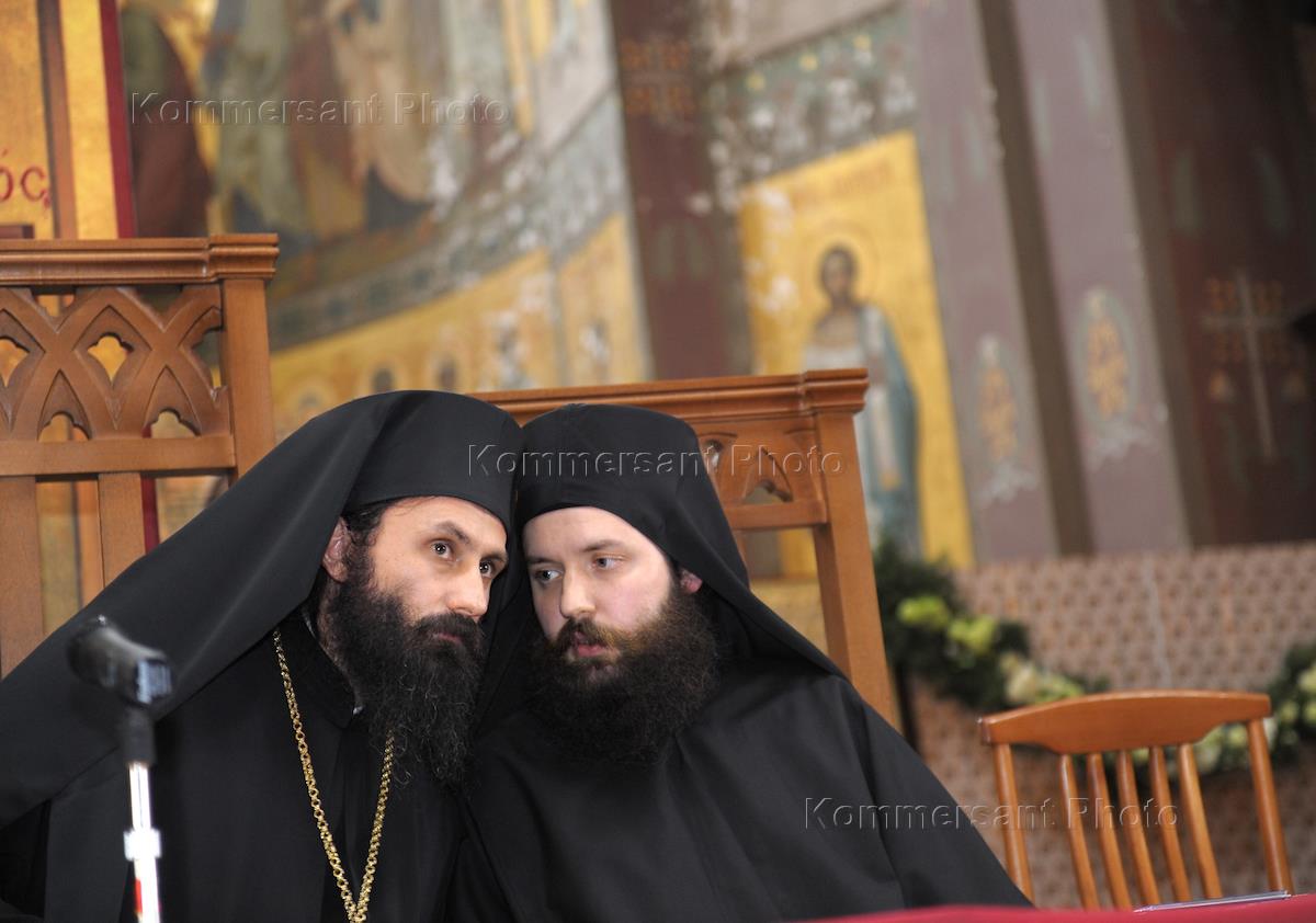 Исполняющий обязанности Епископа Абхазии Отец Виссарион (Аплиа) (слева) и Отец Андрей (Кураев) (справа) во время церковно-народного собрания в Новоафонском монастыре.