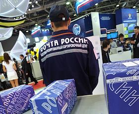 Выставка "Связьэкспокомм 2011" в центральном выставочном комплексе (ЦВК) "Экспоцентр". Надписи на вывесках: "Почта России", "МТС", Omlet.ru.