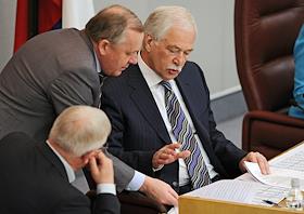 Заседание Государственной думы России. Слева направо: первый заместитель председателя Государственной думы России (ГД) Олег Морозов, член комитета ГД России по бюджету и налогам Виталий Шуба и председатель ГД России Борис Грызлов в президиуме заседания.