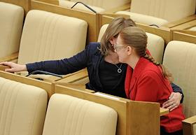 Член Комитета Государственной думы (ГД) России по собственности Екатерина Семенова (слева) и заместитель председателя комитета ГД по финансовому рынку Лиана Пепеляева (справа) во время думского заседания.