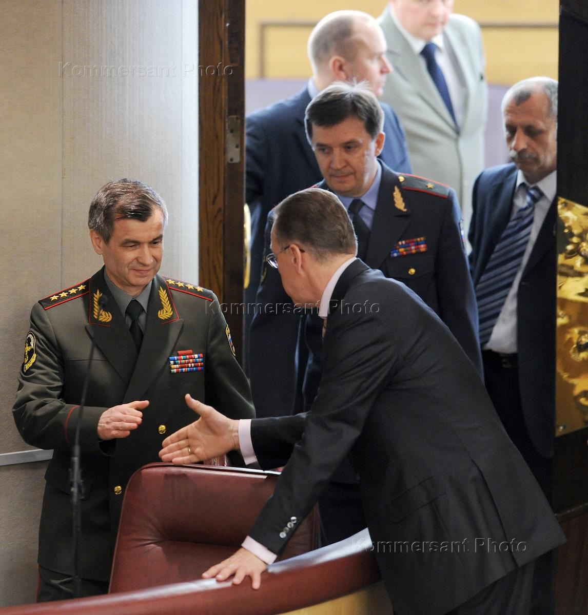 Russian Interior Minister Rashid Nurgaliyev (left) and Plenipotentiary Representative of the Government of Russia in the Russian State Duma Andrey Loginov (second left) during a meeting of the State Duma of Russia.