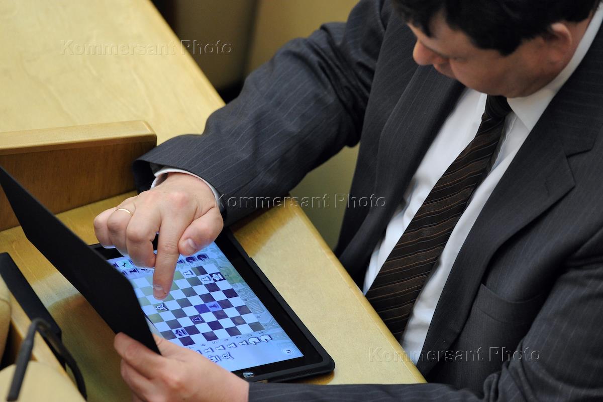 Meeting of the State Duma of Russia. MP plays chess on the iPad.