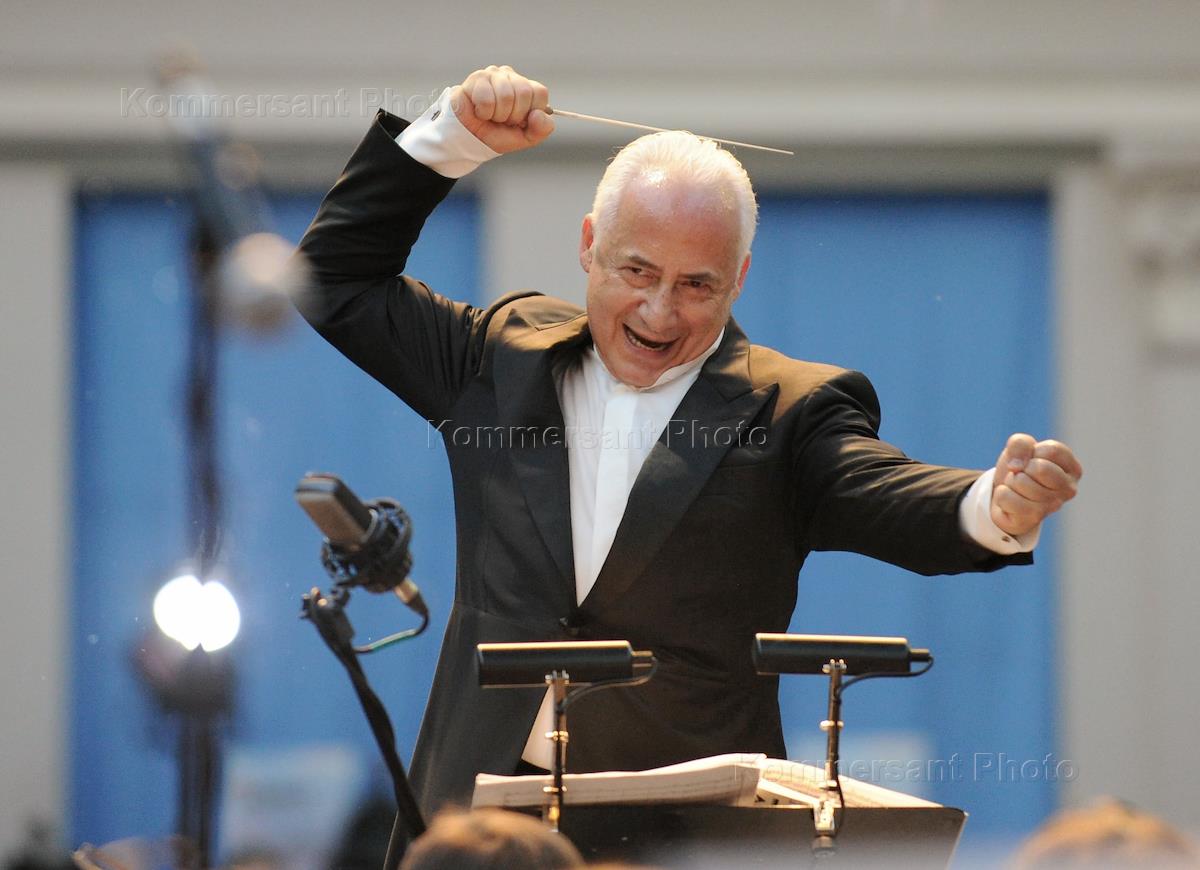 Фестиваль искусств "Черешневый лес". Дирижер Владимир Спиваков во время гала-концерта национального филармонического оркестра России. Концерт прошел на перроне Киевского вокзала.