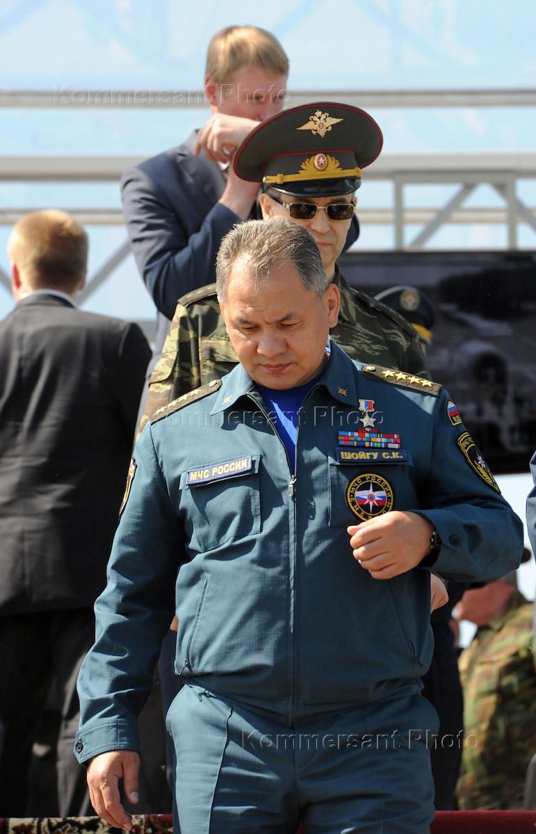 Министр России по делам гражданской обороны, чрезвычайным ситуациям и ликвидации последствий стихийных бедствий Сергей Шойгу во время демонстрационно-полевых учений, в рамках международного салона "Комплексная безопасность - 2011". Учения прошли на полигоне в Ногинске.
