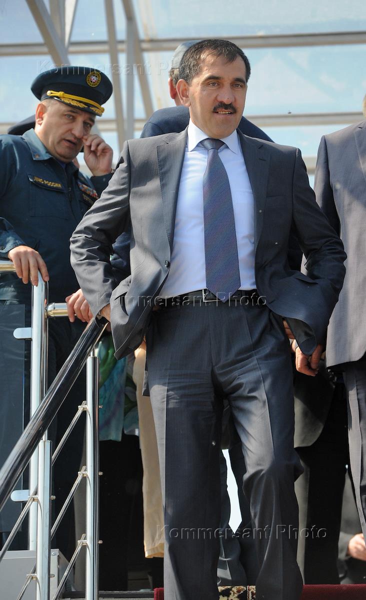 Президент республики Ингушетия Юнус-Бек Евкуров (справа) во время демонстрационно-полевых учений, в рамках международного салона "Комплексная безопасность - 2011". Учения прошли на полигоне в Ногинске.