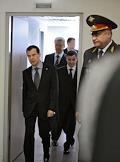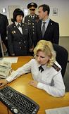 Начальник ГУВД по Москве Владимир Колокольцев (в центре) и президент России Дмитрий Медведев (справа) во время посещения главного управления МВД России по Москве.