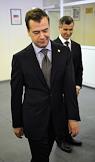 Министр внутренних дел России Рашид Нургалиев (слева), начальник ГУВД по Москве Владимир Колокольцев (второй слева) и президент России Дмитрий Медведев (справа) во время посещения главного управления МВД России по Москве.