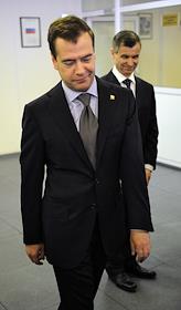 Президент России Дмитрий Медведев (слева) перед началом совещания по вопросам противодействия экстремизму в России. Совещание прошло в главном управлении МВД России по Москве.