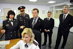 Слева направо: мэр Москвы Сергей Собянин, начальник ГУВД по Москве Владимир Колокольцев и президент России Дмитрий Медведев во время посещения главного управления МВД России по Москве.