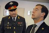 Президент России Дмитрий Медведев (слева) и министр внутренних дел России Рашид Нургалиев (справа) во время посещения главного управления МВД России по Москве.