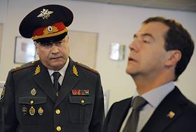 Начальник ГУВД по Москве Владимир Колокольцев (слева) и президент России Дмитрий Медведев (справа) во время посещения главного управления МВД России по Москве.