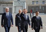 Президент России Дмитрий Медведев (слева), мэр Москвы Сергей Собянин (второй слева), министр внутренних дел России Рашид Нургалиев (второй справа) и начальник ГУВД по Москве Владимир Колокольцев (справа) во время посещения главного управления МВД России по Москве.