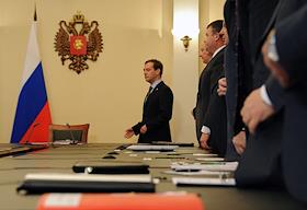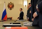 Президент России Дмитрий Медведев (в центре) перед началом совещания по вопросам противодействия экстремизму в России. Совещание прошло в главном управлении МВД России по Москве.