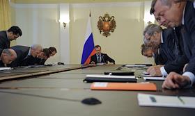 Президент России Дмитрий Медведев (в центре) во время совещания по вопросам противодействия экстремизму в России. Совещание прошло в главном управлении МВД России по Москве.