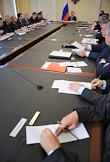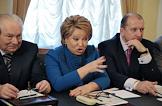 Слева направо: заместитель председателя Верховного суда России Анатолий Петроченков, губернатор Санкт-Петербурга Валентина Матвиенко и губернатор Самарской области Владимир Артяков во время совещания по вопросам противодействия экстремизму в России. Совещание прошло в главном управлении МВД России по Москве.