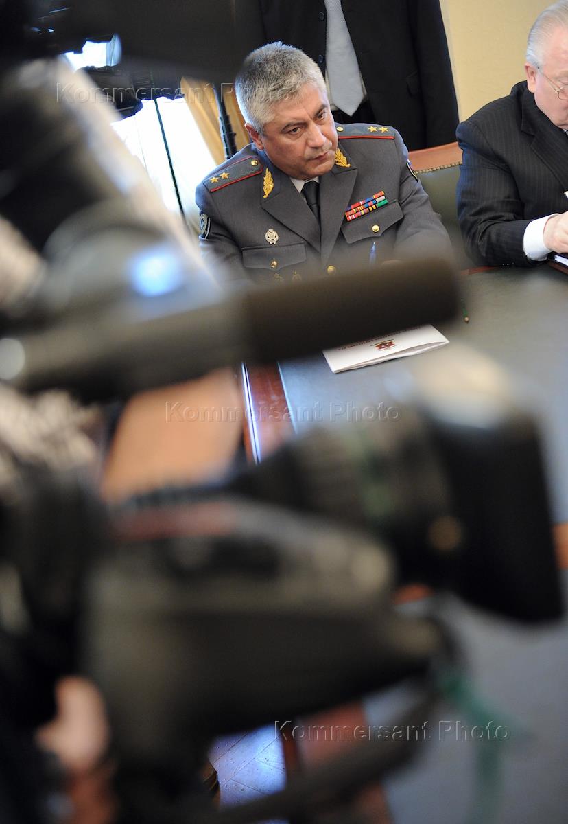 Начальник ГУВД по Москве Владимир Колокольцев во время совещания по вопросам противодействия экстремизму в России. Совещание прошло в главном управлении МВД России по Москве.