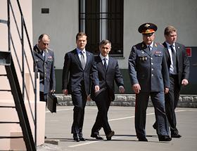 Начальник ГУВД по Москве Владимир Колокольцев (в центре) и президент России Дмитрий Медведев (справа) во время посещения главного управления МВД России по Москве.