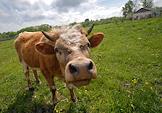 Молодой бычок из личного хозяйства в деревне Виноградовка Липецкой области пасется на лугу.
