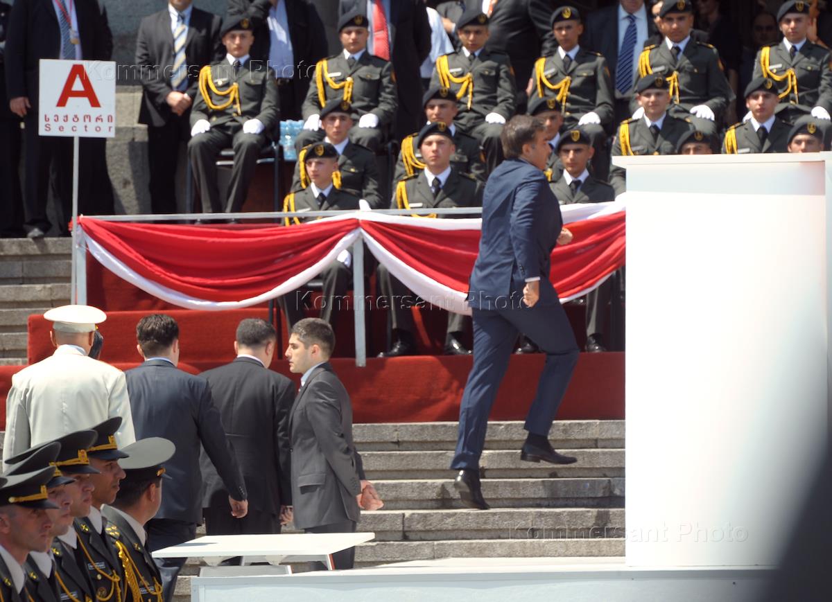 Президент Грузии Михаил Саакашвили (слева) во время военного парада, посвещенного 20-й годовщине Дня независимости Грузии.