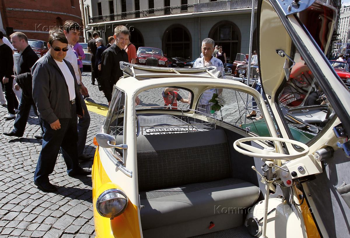 Директор центра инжиниринговых услуг Сбербанка России Сергей Моложавый (в центре) перед стартом ралли L.U.C Chopard Classic Weekend Rally в Третьяковском проезде.