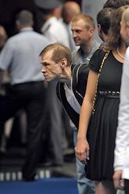Солист группы "Любэ", депутат Государственной думы России Николай Расторгуев (на первом плане справа) с сыном Николаем (на первом плане слева), пресс-секретарь правительства России Дмитрий Песков (слева), тележурналист Владимир Познер (в центре) и продюсер Александр Роднянский (справа) на церемонии открытия XXII кинофестиваля "Кинотавр".