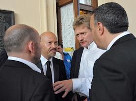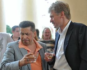 Пресс-секретарь правительства России Дмитрий Песков (слева) и генеральный директор Михайловского театра оперы и балета, глава группы фруктовых компаний JFC Владимир Кехман (справа) на церемонии открытия XXII кинофестиваля "Кинотавр".