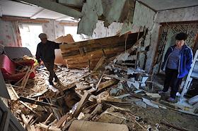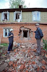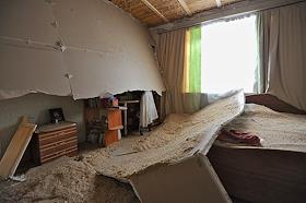 Последствия взрывов на складах 102-го арсенала артиллерийских боеприпасов Центрального военного округа в селе Пугачево (28 км от Ижевска). Разрушенный жилой дом.