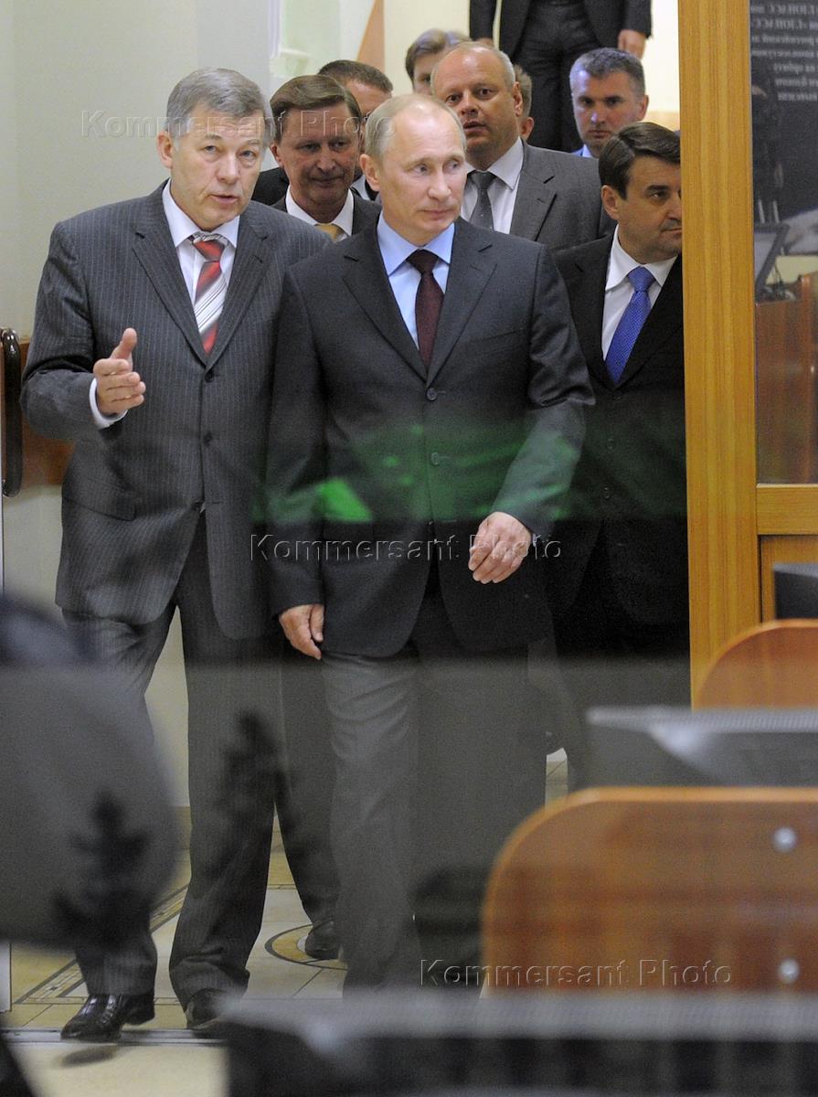 Председатель правительства России Владимир Путин (в центре) и министр транспорта России Игорь Левитин (справа) во время посещения Московского государственного университета путей сообщения.
