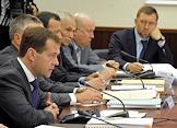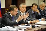 Президент России Дмитрий Медведев (слева) и его помощники Александр Абрамов (в центре), Аркадий Дворкович (второй справа) во время заседания президиума Государственного совета России по вопросу: "О мерах по обеспечению экологической безопасности и ликвидации накопленного экологического ущерба" .