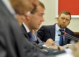 Президент России Дмитрий Медведев (слева) и владелец холдинга "Базовый элемент", генеральный директор компании "РУСАЛ" Олег Дерипаска (справа) во время заседания президиума Государственного совета России по вопросу: "О мерах по обеспечению экологической безопасности и ликвидации накопленного экологического ущерба".