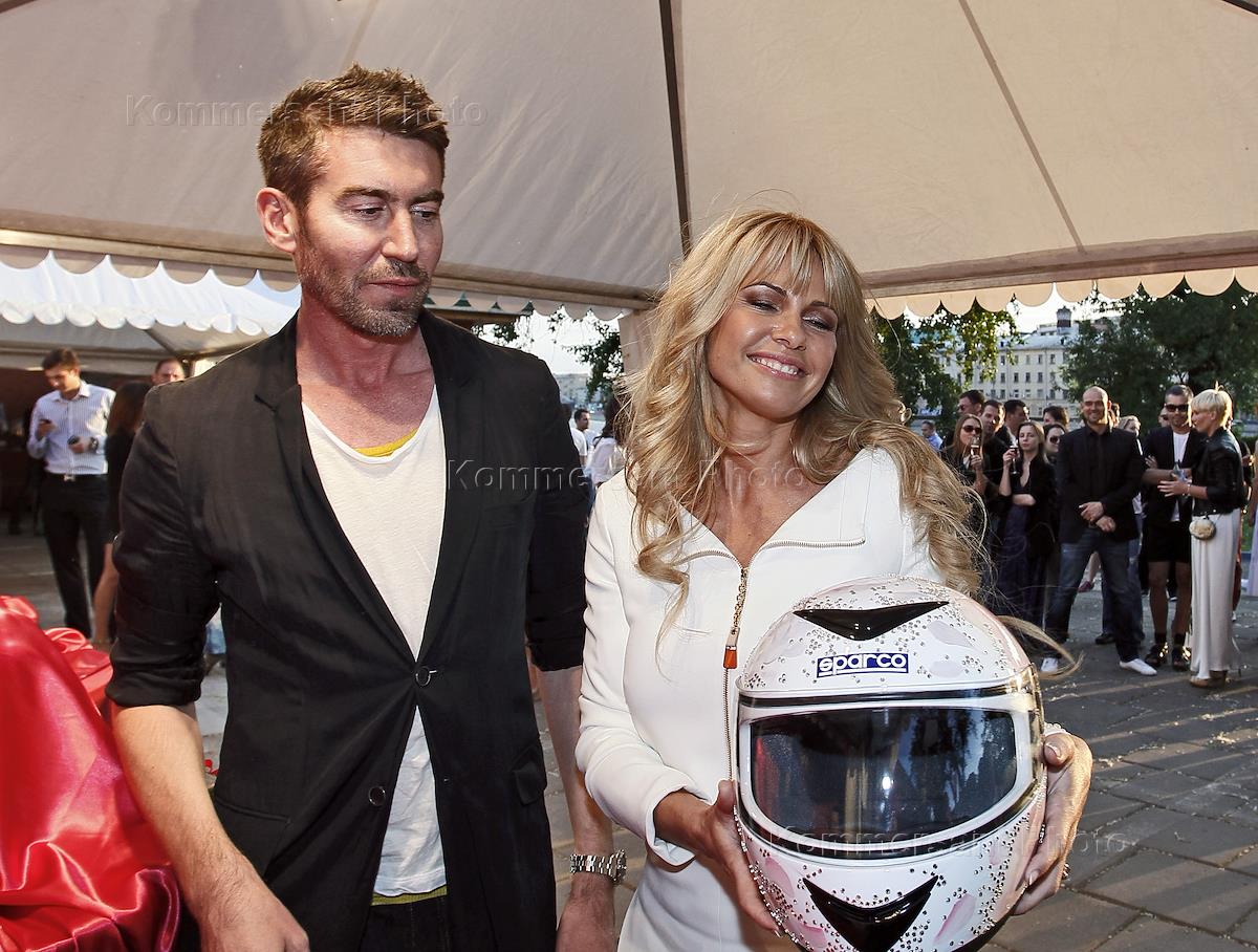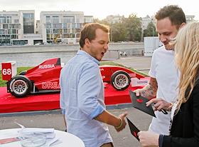 Дизайнер Олег Овсиев (слева) и пилот гоночной серии Formula JK Asia Series Наталья Фрейдина (справа) во время презентации нового проекта Russian Fashion Racing. Презентация прошла в Имперском яхт-клубе на Красном октябре.