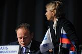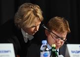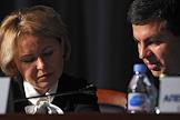 Годовое собрание акционеров ОАО "Газпром нефть". Член правления, заместитель генерального директора по корпоративным коммуникациям ОАО "Газпром нефть" Александр Дыбаль (слева) и член правления, заместитель генерального директора по правовым и корпоративным вопросам ОАО "Газпром нефть" Елена Илюхина (справа) в президиуме собрания.