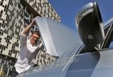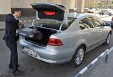 Корреспондент издательского дома "Коммерсантъ" Дмитрий Ждакаев во время тест-драйва автомобиля Volkswagen Passat (Фольксваген Пассат). Погрузка детского кресла в багажник автомобиля.