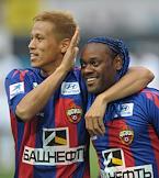 Чемпионат России по футболу. 13 тур. Футболисты Кейсуке Хонда (слева) и Лав Вагнер (справа) во время матча между командами ЦСКА (Москва) - "Анжи" (Махачкала) на стадионе "Арена Химки".