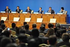 10-й Cаммит Шанхайской организации сотрудничества (ШОС). Слева направо: председатель КНР Ху Цзиньтао, президент России Дмитрий Медведев и президент Республики Казахстан Нурсултан Назарбаев перед началом Саммита.