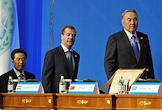 Президент Республики Казахстан Нурсултан Назарбаев (слева) и президент России Дмитрий Медведев (справа) во время 10-го Cаммита Шанхайской организации сотрудничества (ШОС).