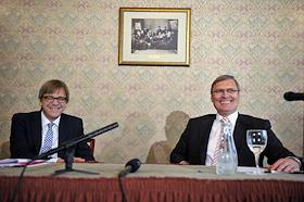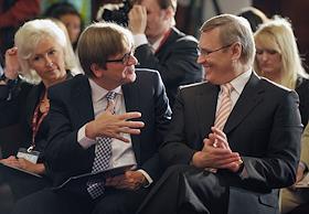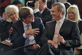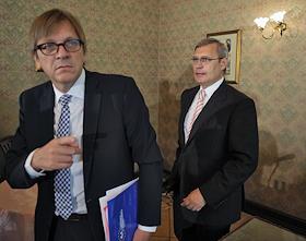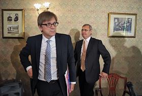 Лидер фракции "Альянс либералов и демократов за Европу" Европарламента Ги Верхофстадт (слева) и лидер Российского народно-демократического союза (РНДС) Михаил Касьянов (справа) во время международной конференции РНДС на тему "Европейский путь для России - верховенство права и нынешние реалии". Конференция прошла в гостинице "Метрополь".