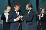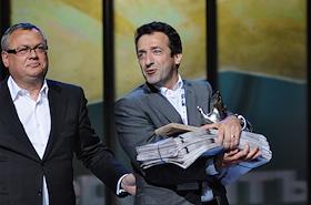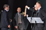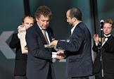 Корреспондент издательского дома "Коммерсантъ" Олег Кашин (слева) и генеральный директор фонда Digital Sky Technologies Юрий Мильнер (справа) во время церемонии вручения премии "Коммерсантъ года" в Михайловском театре.