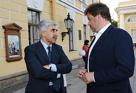 XV Петербургский международный экономический форум. Генеральный директор ОАО "Авиационная холдинговая компания "Сухой" Михаил Погосян (слева) и управляющий партнер Burevestnik Group Андрей Бойко (справа) перед началом церемонии вручения премий "Коммерсантъ года", учрежденной издательским домом "Коммерсантъ" и Ассоциацией менеджеров России. Церемония прошла в Михайловском театре.