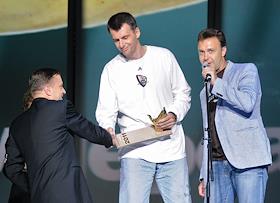 XV Петербургский международный экономический форум. Слева направо: телеведущий Леонид Парфенов, президент компании "Онэксим" Михаил Прохоров и главный редактор газеты "Коммерсантъ" Михаил Михайлин на церемонии вручения премий "Коммерсантъ года", учрежденной издательским домом "Коммерсантъ" и Ассоциацией менеджеров России. Церемония прошла в Михайловском театре.