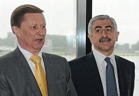 XV Петербургский Экономический Форум. Заместитель председателя правительства России Сергей Иванов (слева) и президент Объединенной авиастроительной корпорации (ОАК) Михаил Погосян (справа) в аэропорту "Пулково".