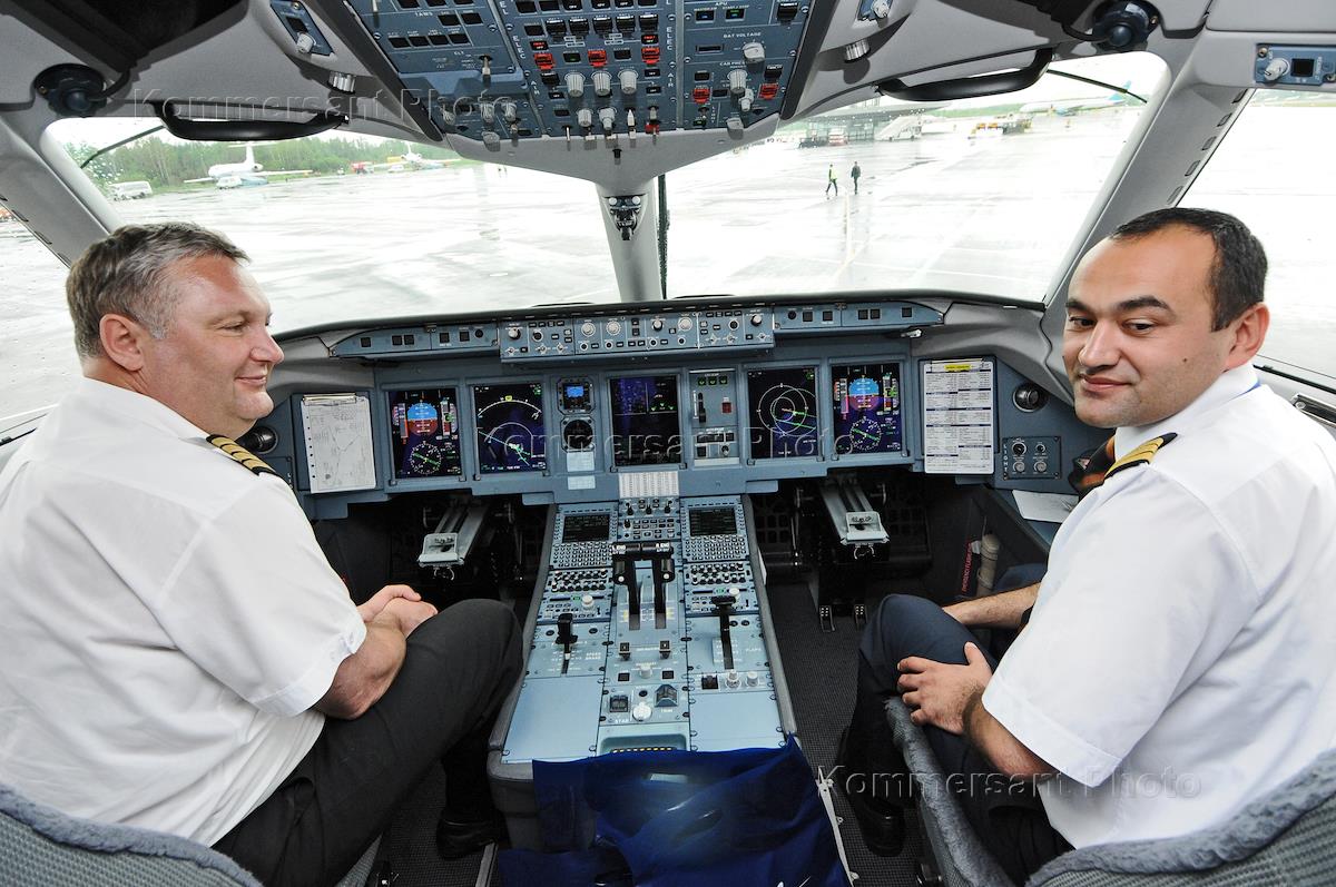 Самолет Sukhoi Superjet 100, совершивший первый рейс, приземлился в аэропорту "Пулково". Пилоты в кабине самолета.