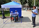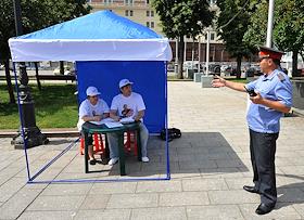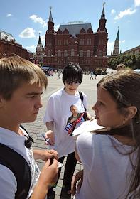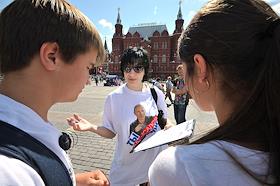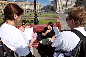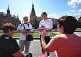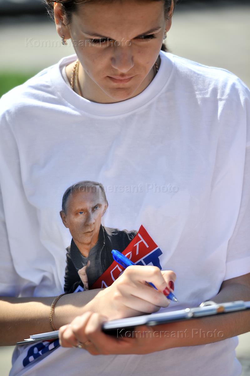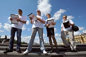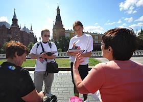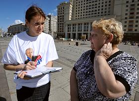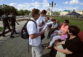 Участники социального опроса москвичей "О программе Общероссийского народного фронта". Соцопрос проведен активистами московского городского отделения движения "Молодая гвардия Единой России". Опрос прошел на Манежной площади.