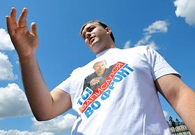 Первый заместитель руководителя Регионального штаба Московского городского отделения "Молодая Гвардия Единой России" Евгений Грачев во время социального опроса москвичей "О программе Общероссийского народного фронта". Соцопрос проведен активистами московского городского отделения движения "Молодая гвардия Единой России". Опрос прошел на Манежной площади. Надпись на футболке "Ты записался во фронт". Грачев Евгений, первый заместитель руководителя Регионального штаба Московского городского отделения «Молодая Гвардия Единой России»