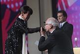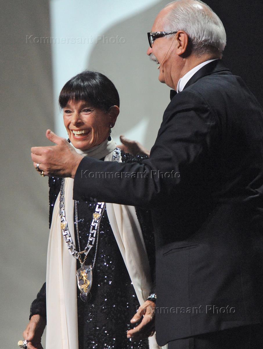 XXXIII Московский международный кинофестиваль (ММКФ). Актриса Джеральдина Чаплин (слева) и президент ММКФ, председатель союза кинематографистов России, кинорежиссер Никита Михалков (в центре) на церемонии открытия фестиваля в кинотеатре "Пушкинский".
