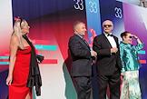 XXXIII Московский международный кинофестиваль (ММКФ). Слева нараво: президент ММКФ, председатель союза кинематографистов России, кинорежиссер Никита Михалков, генеральный директор ММКФ Наталья Семина и режиссер Егор Кончаловский на церемонии открытия фестиваля в кинотеатре "Пушкинский".