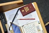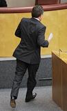 Заседание Государственной думы России. Конституция Российской Федерации и коомпьютер на столе депутата.