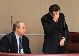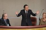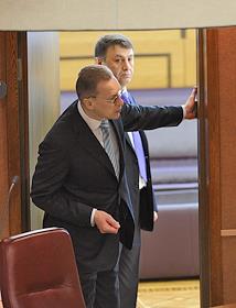 Член комитета Государственной думы (ГД) России по образованию Влерий Рязанский (слева) и председатель комитета ГД по международным делам Константин Косачев (справа) на думском заседании.