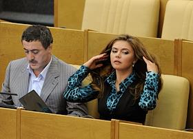 Заместитель председателя комитета Государственной думы (ГД) России по делам Содружества Независимых Государств и связям с соотечественниками Арсен Фадзаев (слева) и члены комитета ГД по делам молодежи Алина Кабаева (справа) во время пленарного думского заседания.